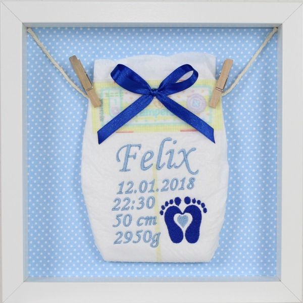 Jeder Bilderrahmen wird in liebevoller Handarbeit gestaltet. Ein besonderer Hingucker ist auf jeden Fall die personalisierte Windel. Dieses wundervolle Erinnerungsstück ist ein besonderes und persönliches Geschenk für Anlässe wie Geburt, Taufe, Geburtstag, …