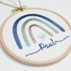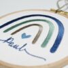 Wundervoller Wandbehang- Stickrahmen rund mit Regenbogen und dem Namen Ihres Kindes. Eine super schöne Geschenkidee zur Geburt. Peppen Sie das Kinderzimmer mit diesem Blickfang auf!