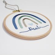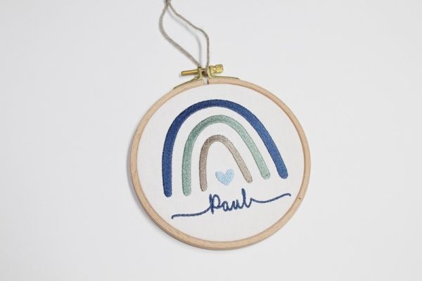 Wundervoller Wandbehang- Stickrahmen rund mit Regenbogen und dem Namen Ihres Kindes. Eine super schöne Geschenkidee zur Geburt. Peppen Sie das Kinderzimmer mit diesem Blickfang auf!